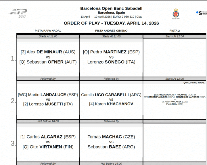 The show must go on: neanche il tempo di riprendere fiato dalla finale persa con Sinner che Carlitos Alcaraz è già a Barcellona. Ovviamente l’uomo copertina del torneo deve essere presente e già nel primo giorno del torneo catalano rilascia la press conference di rito e partecipa ad iniziative collaterali come il palleggio promozionale con Musetti al Montjuic presso la fondazione Miro. Ma già martedì è ora di fare sul serio: il suo esordio è in programma nel tardo pomeriggio contro il finlandese Otto Virtanen.