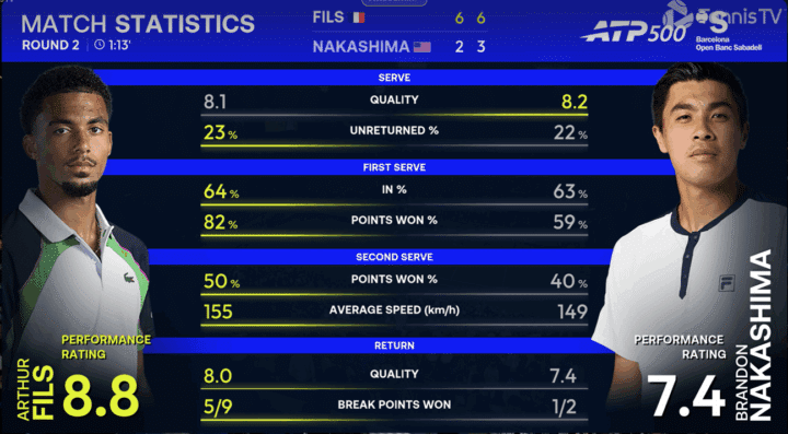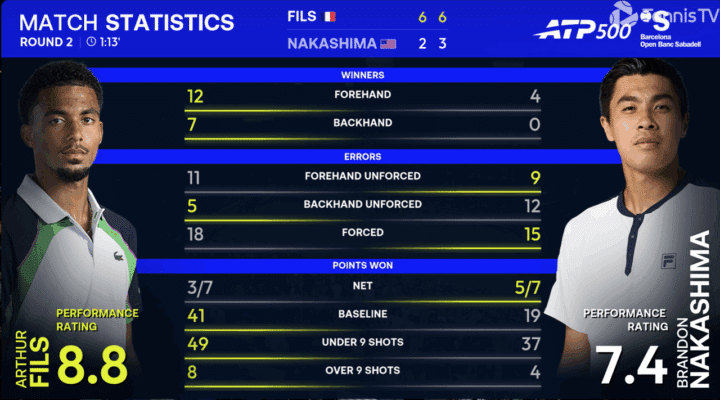 Prestazione impeccabile di Arthur FIls, che in meno di un’ora e un quarto dispone facilmente di un Brandon Nakashima letteralmente travolto all’Open Banc Sabadell di Barcellona. Prestazione di livello del francese che dopo aver balbettato nel primo turno con Atmane e aver salvato addirittura due match point, produce una prestazione notevole