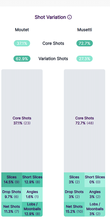 I core shots sono i colpi da fondo in top spin. Le variazioni basicamente tutto il resto. Per dare un’idea Sinner viaggia sull’85% abbondante di core shots e la media ATP è sul 79%.