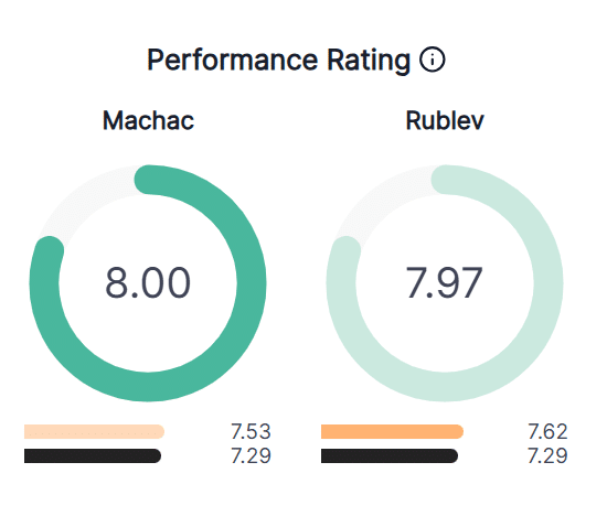 Bel match soprattutto nel primo set, nel quale alla fine ne esce benissimo Rublev. Il russo ritrova un livello di tennis che non si vedeva da tanto e si candida prepontemente ad un posto in finale.