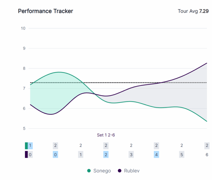 Chiarissimo l’andamento di questo primo parziale, nel quale dopo una partenza lenta, Rublev è andato costantemente in crescendo, mentre per Sonego si è fatta sempre più notte fonda. Le accelerazioni di dritto e le palle corte con cui aveva cominciato il match si son prosciugato e il torinese ha perso le proprie fonti di gioco.