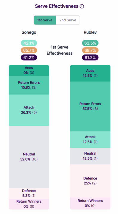 Sonego in questo primo set ha potuto cominciare lo scambio da situazioni di vantaggio solo nel 42% dei casi, contro una media del 66%, dato medio calcolato sulle ultime 52 settimane ATP.