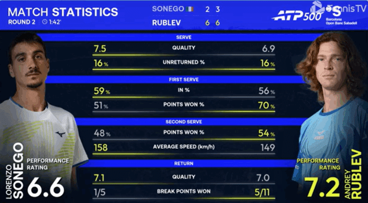Un Sonego non al meglio cede il passo a un Rublev sufficientemente solido al secondo turno dell’ATP 500 di Barcellona. Non sarà la versione più scintillante di Andrey, ma per oggi basta e avanza. Per il russo grande opportunità dopo il forfait di Alcaraz, in quanto si tratta dell’unica testa di serie rimasta nella parte alta del tabellone.