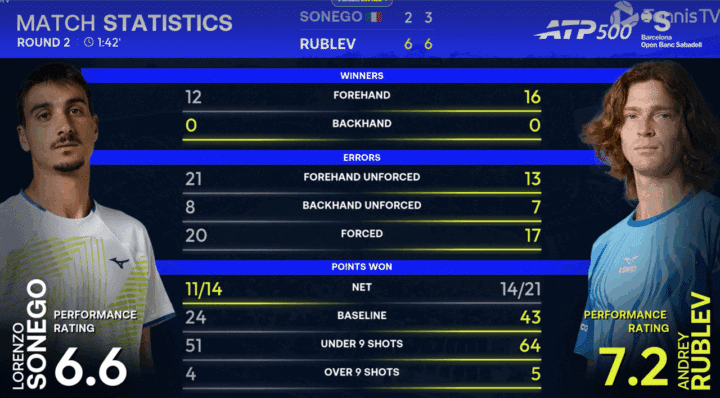 Aver fermato l’emorragia da morale a Sonego che almeno riesce a rimanere in scia nel proseguo del parziale ma alla fine Sonego deve cedere nuovamente il servizio e al terzo match point Rublev chiude la contesa.