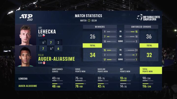 Dopo due set molto combattuti – e due match point sprecati da Auger-Aliassime – alla fine è proprio il canadese a prendere il largo nel terzo set, strappando per la prima (e la seconda) volta nel torneo il servizio di Jiri Lehecka e conquistando l’ottavo titolo in carriera, portandosi a pari merito con Milos Raonic per il maggior numero di titoli ATP conquistati da un canadese. Auger-Aliasssime continua la sua corsa su Lorenzo Musetti in chiave ATP Finals e riduce il distacco a 340 punti dall’ottavo posto dell’azzurro: le ultime settimane della stagione saranno come sempre determinanti per gli ultimi posti.