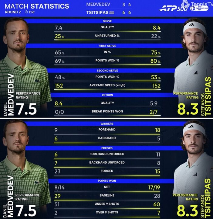 Per Medvedev prosegue il 2026 incolore, con una prestazione incostante al servizio e inconcludente alla risposta, come conferma lo 0 nella casella delle palle break conquistate. Tsitsipas fa registrare migliori numeri per ogni dato: i 27 vincenti, al fronte di 20 gratuiti, sottolineano l’ottima prova del greco, che anche alla battuta ha dati importanti, con l’80% di punti portati a casa con la prima. Il numero 11 ATP chiude in attivo il saldo vincenti-errori, 18 a 16, ma avrebbe avuto bisogno di una spinta in più dal servizio.
