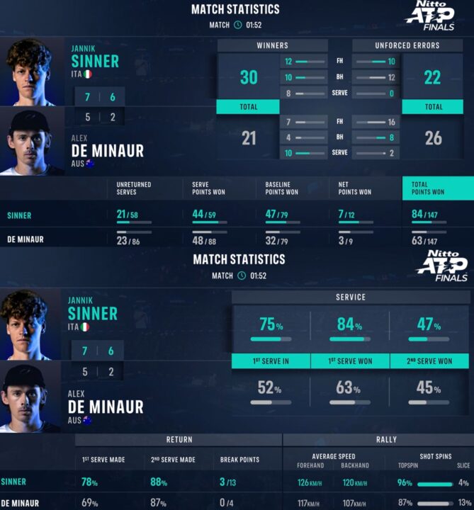 Per De Minaur, Sinner si conferma una montagna insormontabile. In particolare nel primo set, è tatticamente impeccabile, ma contro l’azzurro non basta. In ogni caso, Alex può lasciare Torino con almeno un tabù sfatato: la prima vittoria alle ATP Finals, che, tra l’altro, gli è pure valsa la semifinale.