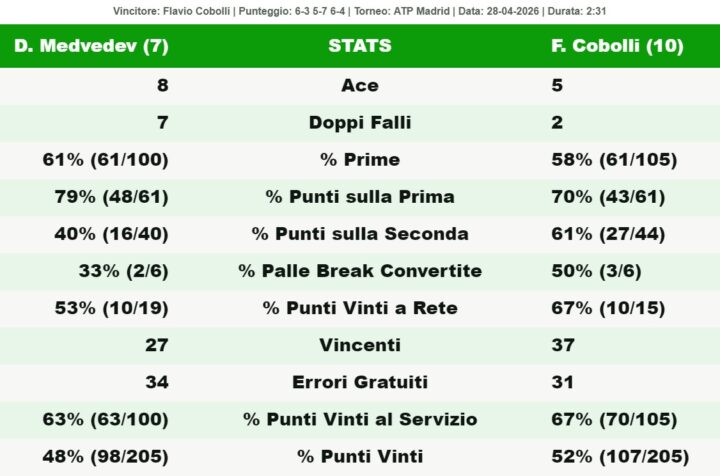 ATP Madrid: Cobolli vince un grande match e va ai quarti per la prima volta in un Masters 100, Medvedev cede al terzo set