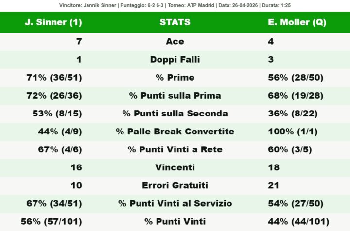 In questo piacevole pomeriggio madrileno Sinner ha sbrigato la pratica terzo turno contro Elmer Moller in meno di 80 minuti, anche grazie alla condotta di gara del suo avversario, sempre pronto a âtirare il grillettoâ dei suoi colpi da fondocampo, specialmente il suo rovescio con il quale riesce a sviluppare velocitĂ di livello assoluto.