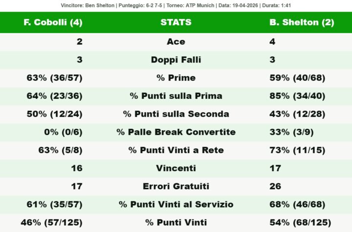 Shelton, invece, strappa il suo primo successo contro un top 20 sul rosso (era 0-4 prima di questa partita). Agguanta il suo quinto titolo, il secondo sul rosso, il terzo a livello 500 e il secondo in stagione dopo Dallas. Diventa poi il primo americano a laurearsi campione a Monaco di Baviera da Ivan Lendl nel 1993. Ma soprattutto, si inserisce tra i nomi da tenere d’occhio anche su questa superficie. A Madrid, in altura, sarà senz’altro un avversario scomodo per chiunque. E con i forfait di Carlos Alcaraz e Novak Djokovic sarà sicuro di essere una delle prime quattro teste di serie.