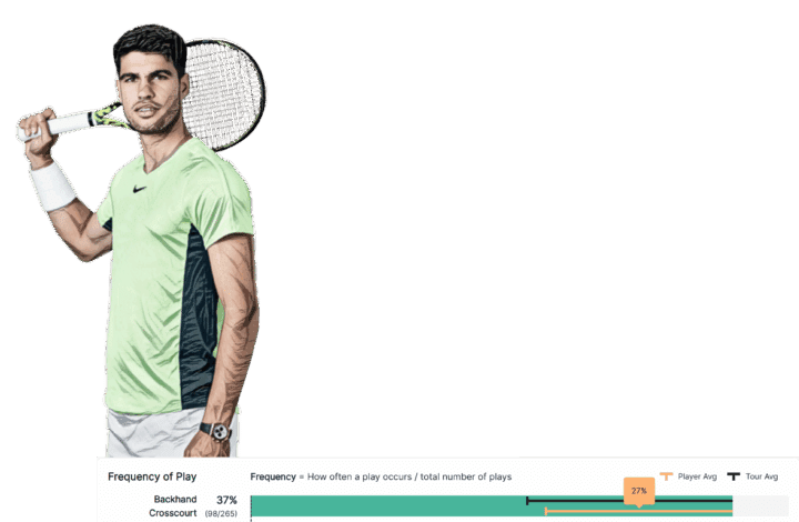 Alcaraz nel match con Sinner ha giocato il 37% dei colpi con il rovescio incrociato, bel il 10% in più rispetto alla sua media.