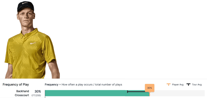 Viceversa Sinner ha giocato esattamente l’ammontare medio dei rovesci incrociati che è solito giocare.