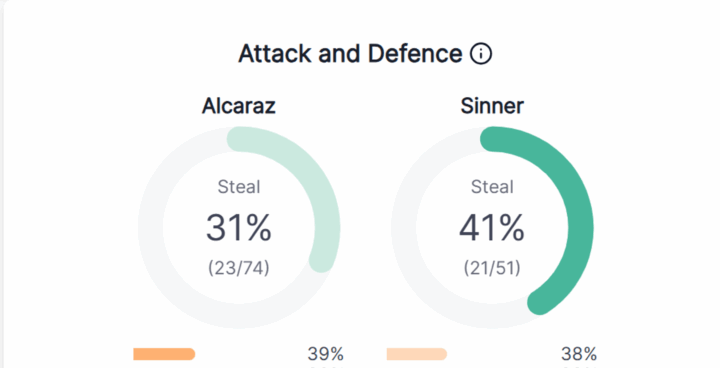 Infine, una minor propensione all’attacco si è tradotta per lo spagnolo anche una minor efficacia nel ribaltare le situazioni da attacco a difesa, una delle specialità di casa Alcaraz. Lo spagnolo che di solito è leader in questa specialità contro Jannik è andato sottomedia di 8 punti percentuali.
