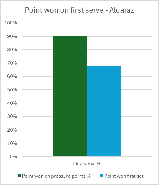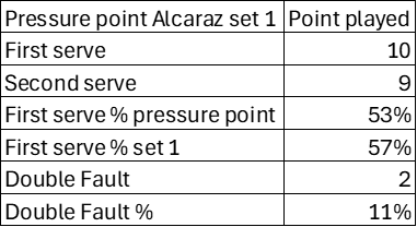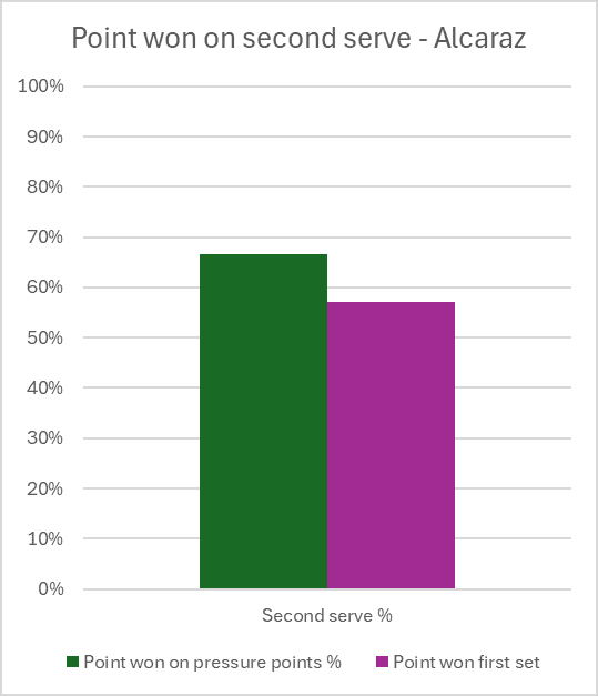 Alcaraz dopo un avvio brillante di primo set è completamente andato in apnea, soggiogato dalla spinta da fondo di Sinner. Lo spagnolo ha dovuto giocare spesso volentieri nel primo punti pesanti, i cosiddetti pressure points.
