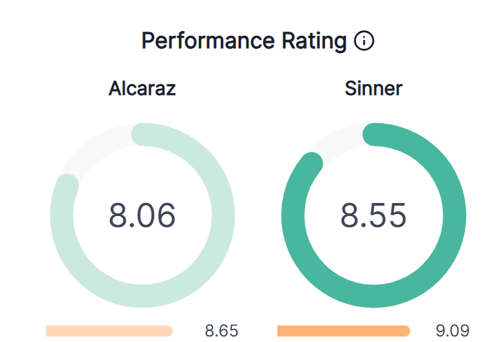 Con riferimento alle performance medie di Alcaraz e SInner effettivamente i dati confermano che la partita di Montecarlo è stata influenzata dal vento in quanto la performance in quel match è stata per entrambi inferiore, quasi in egual misura.