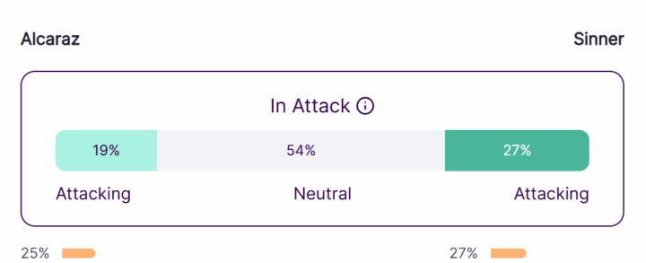 Rispetto alla norma Alcaraz è riuscito a impostare meno situazioni di attacco mentre Sinner ancora una volta è riuscito a stare in media e nella sua confort zone di attacco, senza andare fuori giri. Per capire se ci troviamo in una fase di attacco, neutralità o difesa vengono analizzate varie metriche: