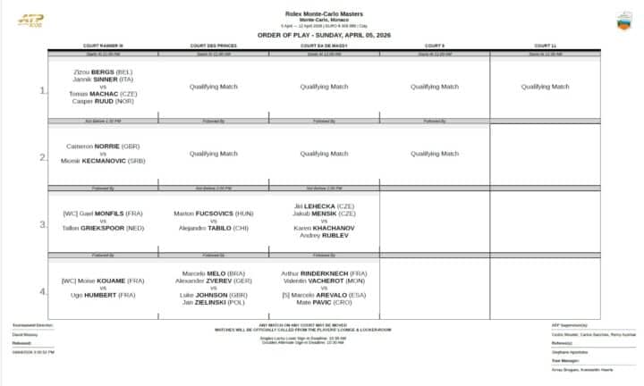 Sul campo principale del Principato, a Pasqua sono poi previsti tre primi turni del singolare: Norrie-Kecmanovic, Monfils-Griekspoor e Kouame-Humbert. Da questo match uscirĂ lâavversario al primo turno di Jannik Sinner, il cui esordio Ăš dunque previsto per martedĂŹ 7 aprile.
