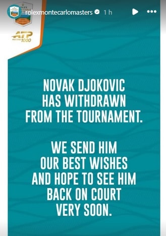 Novak Djokovic non sarà ai nastri di partenza del Rolex Monte-Carlo Masters, primo grande torneo su terra battuta in programma dal 5 al 12 aprile nel Principato di Monaco. “Novak Djokovic si è ritirato dal torneo. Gli facciamo i nostri migliori auguri e speriamo di poterlo rivedere in campo molto presto”, recita il messaggio pubblicato nelle storie Instagram dal profilo ufficiale del torneo.
