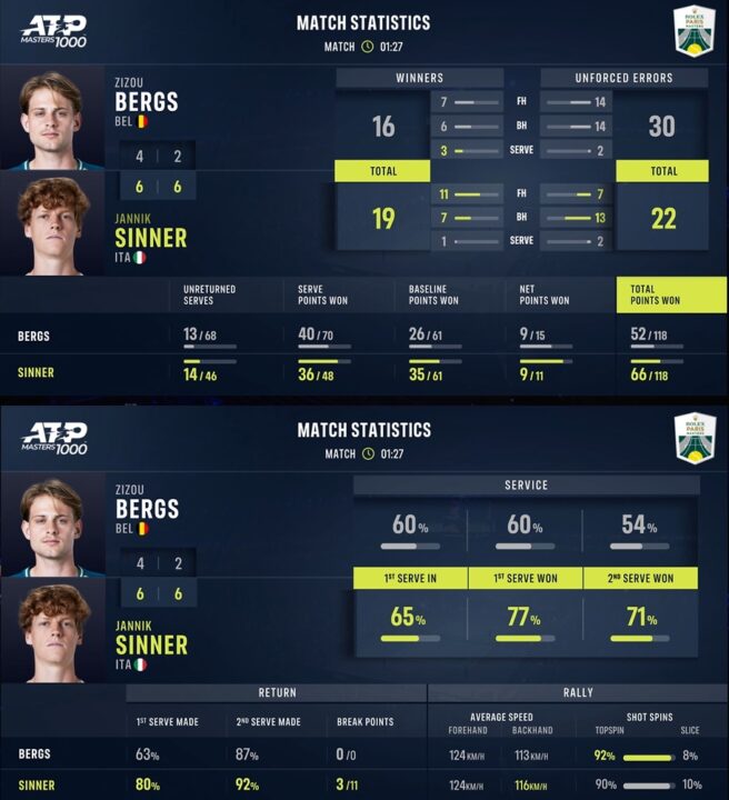 I primi due turni di servizio di Bergs sono caratterizzati dalla sofferenza: nel primo cede la battuta dopo 20 punti e dopo aver annullato quattro palle break (1 a 0 Sinner) mentre nel secondo riesce in qualche modo a salvarsi dopo 14 punti e dopo aver cancellato due palle dello 0 a 3. Il canovaccio tattico del match sembra abbastanza chiaro: Bergs prova a scappare dal braccio di ferro degli scambi da fondocampo grazie a tutti gli angoli del proprio – meraviglioso – talento mentre Jannik impone la sua, personalissima, velocità di crociera al ritmo della partita.