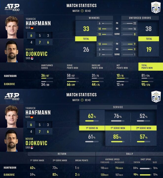 Sono servite 2 ore e 42 minuti a Novak Djokovic per spegnere lâentusiasmo di uno scatenato Yannick Hanfmann. Con lo score di 4-6 7-5 6-3 in suo favore, Nole, ha raggiunto il 112° ottavo di finale della sua carriera in un torneo Masters 1000, eguagliando Rafael Nadal.