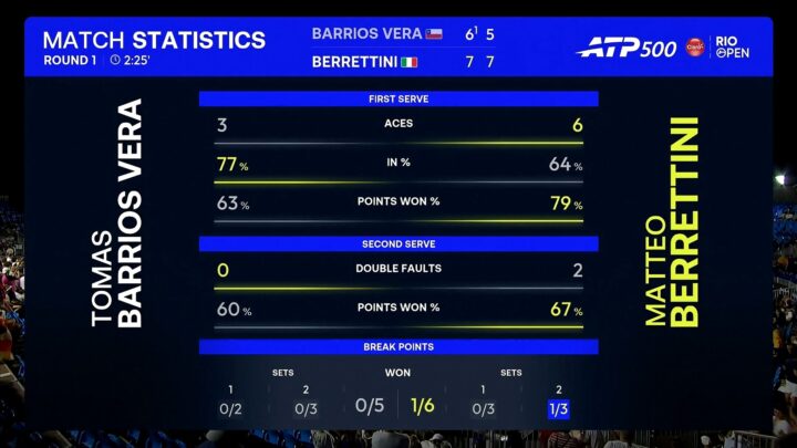 Dopo una lunga pausa causata da alcuni problemi tecnici, Berrettini deve subito annullare una palla break al rientro in campo. Barrios Vera grazia Matteo con un erroraccio al volo. Il secondo assalto agli equilibri porta ancora la firma del cileno, che nel settimo gioco ha altre due chance di break. Se sulla prima Ăš bravo lâazzurro a piazzare lâaccelerazione di diritto in uscita dal servizio in equilibrio precario, sulla seconda il numero 107 del mondo regala con il medesimo fondamentale.
