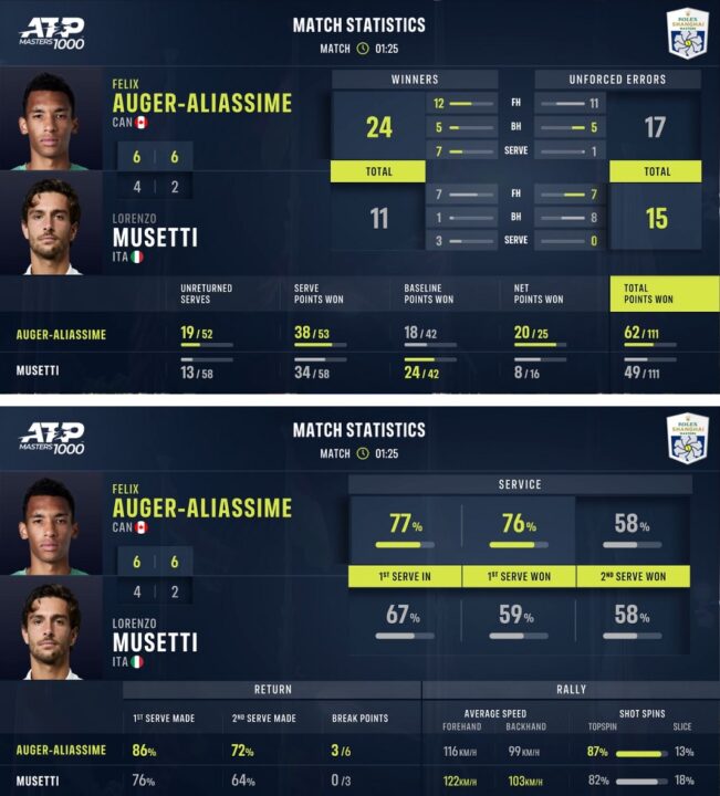 Felix Auger-Aliassime (25 anni, numero 13 del ranking mondiale) vince l’undicesimo degli ultimi tredici match disputati sul circuito, supera Lorenzo Musetti (23 anni, numero 9 ATP) e si qualifica per la prima volta in carriera ai quarti di finale del Rolex Shanghai Masters: il tennista canadese ha disputato una partita perfetta (sicuramente la migliore della carriera nei pressi della rete), è riuscito a contenere il numero degli errori gratuiti (17, a fronte di 24 colpi vincenti) e si è imposto con il punteggio di 6-4 6-2 in un’ora e 25 minuti di gioco.