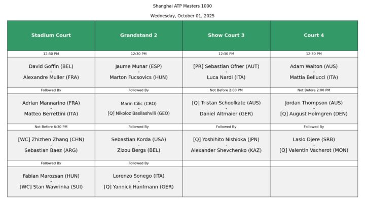 No, neanche la prossima settimana vedremo una finale tra Jannik Sinner e Carlos Alcaraz, dal momento che lo spagnolo ha rinunciato al Masters 1000 di Shanghai in partenza mercoledì 1° ottobre. Il suo posto nella prima riga in alto del tabellone è stato preso da Corentin Moutet, diventato 33° del seeding. Nonostante la delusione (anche se, probabilmente, non di tutti i tennisti, tra cui Tien e Kecmanovic sorteggiati sulle righe tre e quattro, e lo stesso Corentin, che dopo Cilic al primo turno avrebbe avuto Djokovic), andiamo a vedere il programma della prima giornata del Rolex Shanghai Masters.