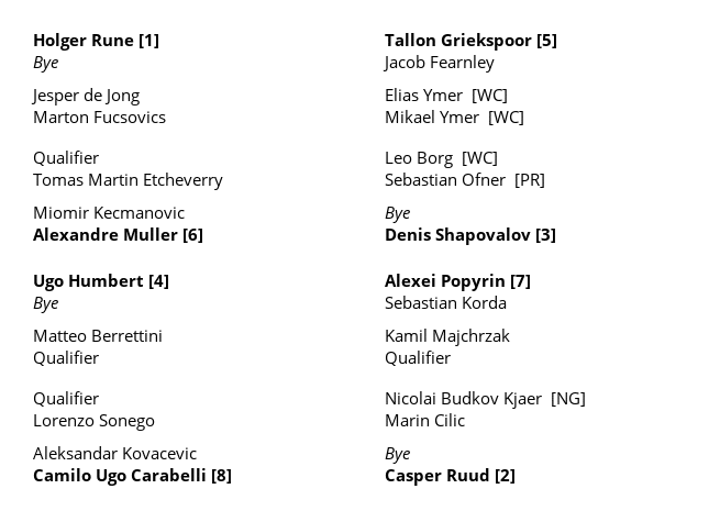 In cima al seeding troviamo Holger Rune, prima testa di serie e alla ricerca di risposte dopo un 2025 finora altalenante. Il danese entrerà in gioco direttamente al secondo turno, dove attende il vincente tra Marton Fucsovics e l’olandese Jesper De Jong. Nella parte opposta del tabellone, invece, figura Casper Ruud, n. 2 del seeding, pronto a sfidare il vincitore del match tra il Next Gen Nicolai Budkov Kjaer e Marin Cilic, altro veterano del circuito ATP. Occhio anche alla testa di serie n. 3, Denis Shapovalov, canadese talentuoso e imprevedibile, che ha dimostrato di poter far bene sul veloce indoor, e proprio a Stoccolma vinse il suo primo titolo.