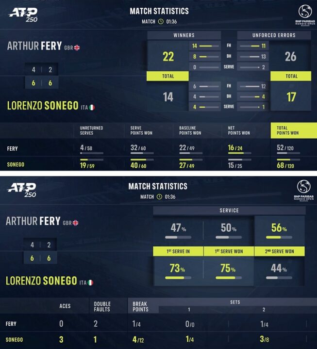 Sonego si è affidato alla sua prima di servizio per tirarsi fuori da alcuni giochi delicati in avvio di gara. Poi ha trovato fiducia nei suoi colpi e soprattutto ha spinto molto col diritto creando difficoltà al suo avversario. Ha spesso chiamato a rete Fery, mettendolo in difficoltà con una serie di variazioni. Il britannico parte bene spingendo con il servizio e presentandosi a rete per accorciare gli scambi. Sonego si arrampica nei suoi turni di servizio e poi si ritrova 0-40 nel nono gioco con Fery alla battuta.