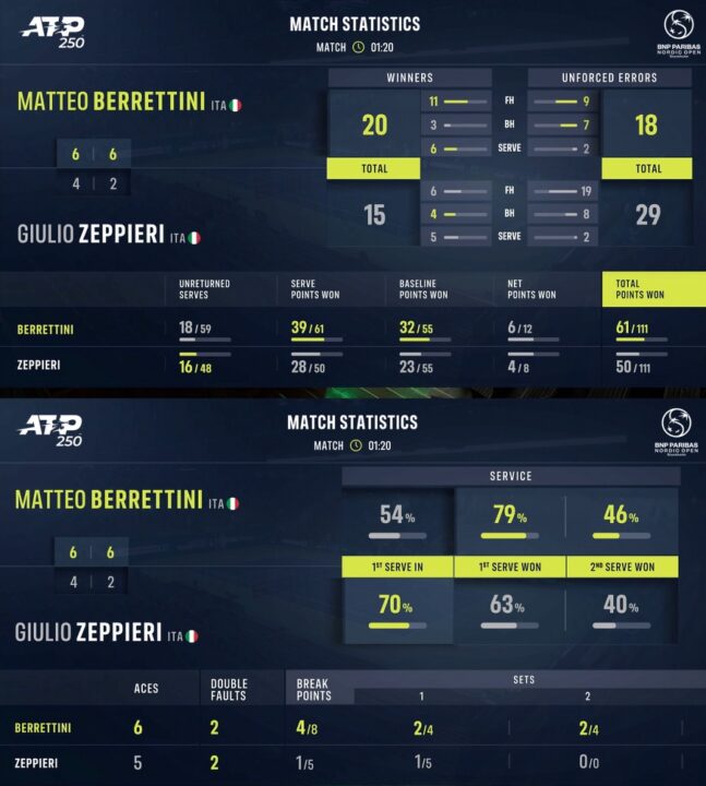 Quattro giochi senza particolari scossoni, poi Matteo fa un paio di numeri (delizioso il passante slice di rovescio) e sorpassa. È in completo controllo, mentre Giulio pare non crederci più e concede un altro break dopo un piccolo disastro a rete. Berrettini chiude agilmente 6-2 sigillando con il sesto ace.