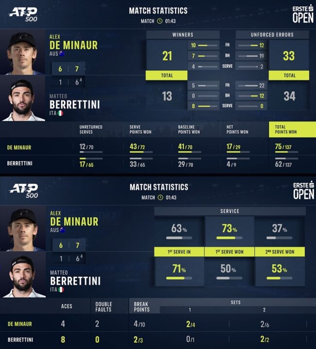 Matteo scende in campo subito con piglio molto aggressivo, costringendo l’australiano a salvare una palla break già nel primissimo game del match. Il primo break della partita però arriva nel game immediatamente successivo, dove De Minaur recupera uno svantaggio di 40-15 e con tre ottimi vincenti strappa il servizio. De Minaur si muove con una rapidità disarmante, mettendo in crisi il piano di gioco del romano, che invece fatica non poco a tenere il ritmo dell’avversario, che risponde con estrema facilità alle prime a più di 200 orari di Matteo. Nel quarto game arriva infatti un altro break a favore del numero 7 del mondo che si porta in vantaggio 4-0. Nel sesto game Matteo riesce anche a tenere il proprio turno di servizio, ma l‘andamento del set è ben definito, se lo porta a casa nettamente De Minaur