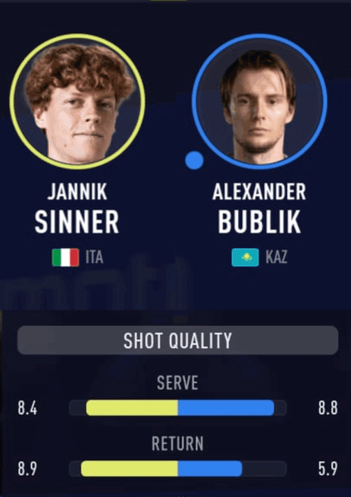 Prestazione in risposta di Jannik di stato di alto livello anche in virtì della qualità del servizio di Bublik. Jannik è sembrato quasi trovarci gusto nel replicare alle bordate al servizio di Alex, spesso e volentieri sopra i 210 Km/h con la prima palla.