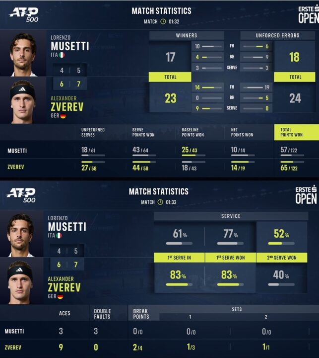 Contro Alexander Zverev, Lorenzo Musetti non riesce a replicare il risultato degli ultimi tre confronti diretti, dai quali era sempre uscito vincitore, compreso quello di un anno fa nei quarti proprio a Vienna, quando rimontò un set di svantaggio. Nella semifinale di sabato, il tedesco si è imposto 6-4 7-5 in un’ora e mezzo, dando un’autentica dimostrazione di forza al servizio: con zero palle break concesse, si è fatto bastare un break per set per raggiungere Jannik Sinner in finale dell’Erste Bank Open. Musetti invece farà rotta verso Parigi, con l’ottavo posto della Race da difendere, forte dei 440 punti di vantaggio sul primo inseguitore, Felix Auger-Aliassime.
