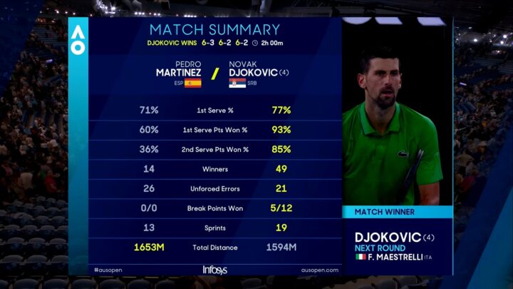 Novak Djokovic inaugura il suo Australian Open con una prestazione di assoluto controllo, superando Pedro Martinez in tre set nell’ultimo match di giornata sulla Rod Laver Arena. Davanti a una tribuna carica di tifosi serbi e non solo, il numero 4 del seeding gioca un match solido e senza sbavature, centrando la centesima vittoria in carriera a Melbourne. Lo spagnolo prova a resistere e a lottare, soprattutto nei propri turni di servizio, ma la qualità, la profondità e la continuità del serbo fanno rapidamente la differenza.