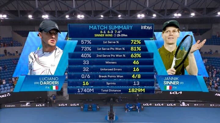 Botte da orbi in un nono game che vale il prezzo del biglietto. Luciano la mette sul piano di fisico, e a distanza di un’ora e trenta dall’ultima volta, torna a riavere palla break. Darderi trova finalmente il campo con continuità, riuscendoci anche col colpo dolente, il rovescio, piegando Sinner sulle gambe al termine di uno scambio massacrante. Per la prima volta nell’incontro, il numero due del mondo va in difficoltà, ma con la solita lucidità da campione si tira fuori dai guai, concludendo il game con un delizioso serve and volley. Jannik torna a fare il Sinner dopo la parentesi difensiva, ma Darderi, lontano dalla vulnerabile versione d’inizio partita, riesce a salvare due match point, allungando la permanenza sulla MCA. Le staffilate del classe 2002 creano problemi persino a un tennista di ritmo come Jannik, costretto a subire qualche imbarcata anche all’alba del tiebreak, per poi ricominciare il suo dominio, accaparrandosi la lotteria dei sette punti con grande ordine e staccando il pass per i quarti di finale dell’Australian Open.