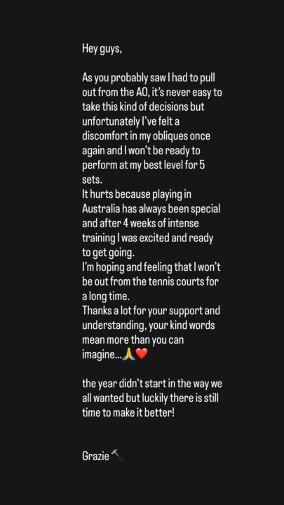 Come avrete visto, ho dovuto ritirarmi dagli Australian Open, non è mai facile prendere questo tipo di decisioni ma purtroppo ho sentito di nuovo un fastidio agli obliqui e non sarei pronto a esprimermi al mio massimo livello per 5 set.