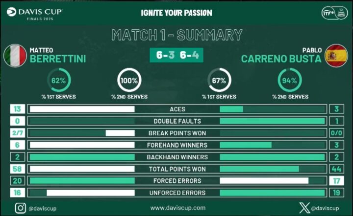 Berrettini potrebbe dare la spallata decisiva a inizio secondo set quando sul primo turno di Carreno va 15-40. Ma stavolta lo spagnolo si salva con una ace mentre sulla seconda opportunità Matteo tira un diritto fuori. Il nostro numero 2 però va come un treno quando batte trovando con buona costanza anche gli ace (saranno in tutto 13). Carreno regge fino al 4-4 poi ancora una volta si scioglie nel momento cruciale del set. Due gratuiti, un attacco debole che Matteo azzanna con rovescio vincente e ci sono tre palle break per andare a servire per il match per Berrettini. Solito ace di emergenza per lo spagnolo, poi però una risposta profonda di Berrettini chiude il gioco. Un ace, un paio di gratuiti di Carreno (che sul primo prende un warning per essersi lamentato del brusio del pubblico tirando una racchettata alla sedia dell’arbitro) e una risposta in rete. Berrettini che ha lasciato solo 12 punti alla risposta chiude 6-3 6-4 e porta l’Italia in vantaggio.