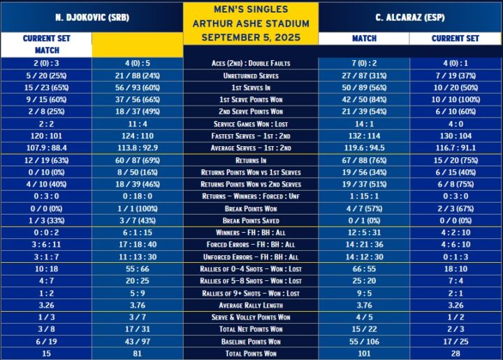 Una sfida in cui Alcaraz ha messo in mostra potenza, atletismo, giocate di gran classe, per una superiorità che non era in discussione, a differenza del risultato perché lo sappiamo capace di perdere questi incontri tra piccoli blackout e naturalmente un avversario che più di tutti è maestro a insinuarsi nei dubbi avversari. Un Djokovic che ha giocato il match che aveva in testa, ma il ritmo imposto dall’avversario ha esatto sulle gambe del trentottenne un tributo viepiù pesante, diventato decisivo sul punto del tie-break del secondo set quando Nole ha avuto l’occasione di agguantare l’avversario dopo avergli recuperato due mini-break. Il calo vistoso nelle battute iniziali del terzo è stato più che comprensibile, ma il campione di Belgrado è riuscito a non far dilagare – almeno non eccessivamente nel punteggio – un Carlos che ha trasformato l’84% delle prime in campo (non tantissime, 56%, ma l’efficacia non pare più in discussione).