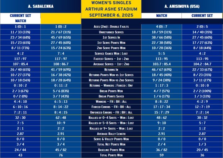 Non si compie dunque la favola di Anisimova, alla sua seconda finale Slam consecutiva dopo le lacrime della sconfitta di Wimbledon persa 6-0 6-0 contro Iga Swiatek e la tensione. Nel sabato newyorkese, la classe 2001 del New Jersey ha messo in campo il tennis che voleva, ma non ha… messo in campo un numero di vincenti sufficiente a compensare gli errori. E ha pesato anche quel 36% di conversione della seconda battuta, con 7 doppi falli.