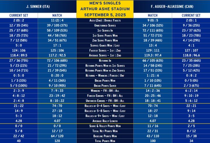 Con il pubblico dell’Arthur Ashe a spingerlo, Felix non trema. Conquista tre set point e gli basta il primo: un ace, come a suggellare la sua reazione: 6-3 in 39 minuti, punteggio giusto per un parziale in cui il canadese ha saputo alzare il livello, scegliendo con coraggio i momenti in cui affondare. Sinner, invece, ha pagato l’assenza della prima di servizio, ferma al 50%: a questi livelli, la frittata è presto servita. A fine set Sinner va negli spogliatoi per un medical time out, lamentando problemi all’addome.
