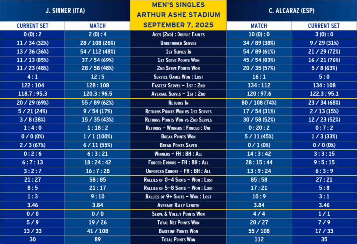 Con 45 punti vinti su 54 prime di servizio servite, Alcaraz ha neutralizzato la risposta, il miglior colpo di Sinner, ed è riuscito a tenere il comando degli scambi per quasi tutto il match evitando di entrare sul territorio di Sinner, ovvero i lunghi scambi ad alta velocità.
