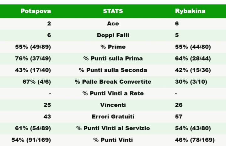 Comincia con un doppio fallo, che Potapova interpreta correttamente come un segnale per rientrare e lo fa strappando a zero la battuta kazaka – più che strappo, l’altra gliela consegna, ma vale lo stesso. Tie-break, allora. Dopo i sei mini-break consecutivi nella parte centrale, entrambe si aggrappano al servizio per annullare un paio di set point a testa, finché Anastasia rompe l’equilibrio facendo suo un grande scambio per poi confermare con uno strepitoso rovescio in uscita che le vale la frazione. 29 errori non forzati per Potapova, 33 per Rybakina.