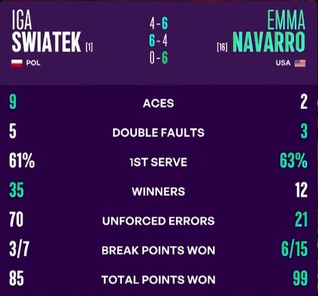 Le sorprese sembravano finite per l’intenso mercoledì cinese, ma Emma Navarro ha deciso di piazzare il secondo “colpaccio” di giornata, siglando l’upset ai danni della campionessa di Wimbledon, Iga Swiaek. La polacca è entrata sul Diamond Court con ottime intenzioni, mettendo subito a segno il break in suo favore, ma l’inspiegabile calo di rendimento e il numero ragguardevole di gratuiti ha stravolto il primo parziale, indirizzandolo verso la statunitense. Navarro ha così messo in cassaforte il set per 6-4, e all’alba del secondo, si è concessa il lusso di strappare il servizio a Iga per la terza volta nel match. La numero due del ranking, in palese difficoltà, ha provato ad alzare il ritmo col dritto, ritrovando un pizzico di fiducia necessaria per pareggiare il numero dei set. Nel set decisivo, però, Swiatek è crollata, alzando vertiginosamente la cifra degli errori commessi, e subendo un rarissimo bagel (il nono in carriera), questa volta per opera di Emma Navarro.