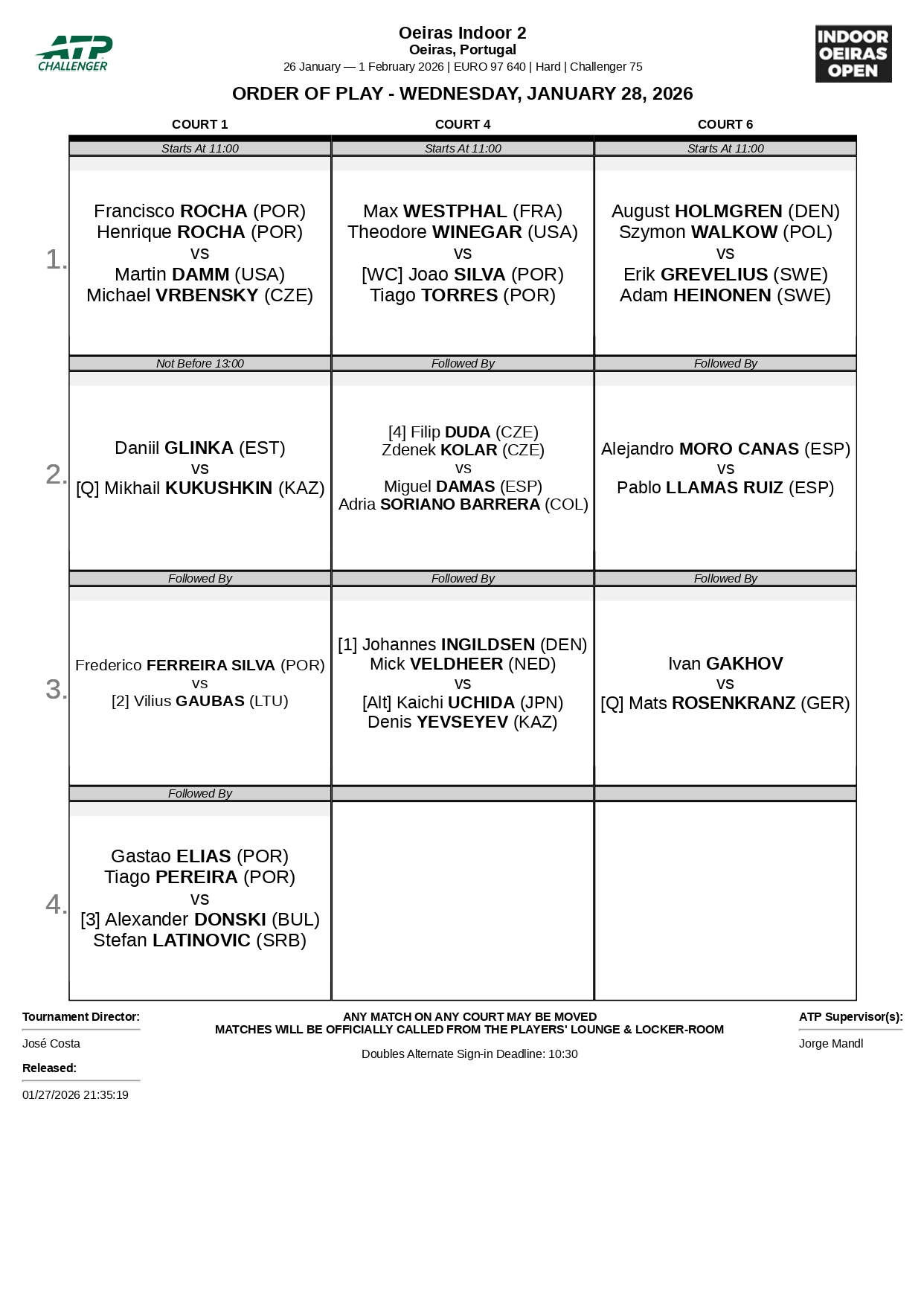 Holmgren, derrotado logo a abrir no primeiro torneio, mas campeão do Eupago Porto Open em 2024, detém um ténis adaptado aos pisos rápidos (excelente serviço e direita e uma esquerda a uma mão que funciona melhor nessas superfícies) e conquistou o primeiro sorriso de 2026 ao bater o lucky loser colombiano Adria Soriano Barrera (359.º), que entrou no quadro para o lugar de Zsombor Piros, lesionado no gémeo esquerdo. O húngaro jogou a final do Indoor Oeiras Open pelo segundo ano consecutivo no passado domingo e estava visivelmente limitado.