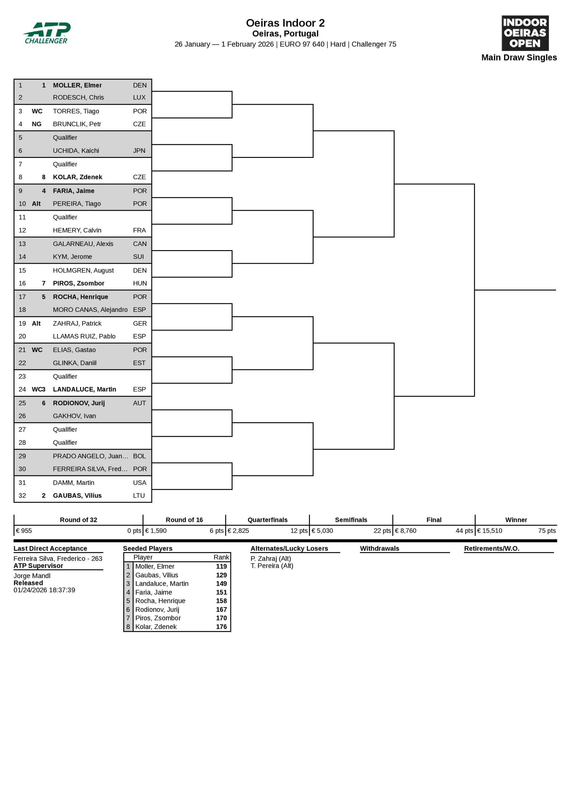 Frederico Silva (265.º) vai enfrentar o bolibiano Juan Carlos Prado Angelo (210.º), Gastão Elias (370.º) o estónio Daniil Glinka (200.º), semifinalista do Indoor Oeiras Open 1, e Tiago Torres (764.º) o chego Petr Brunclik (313.º), top 10 de juniores há um ano e meio.