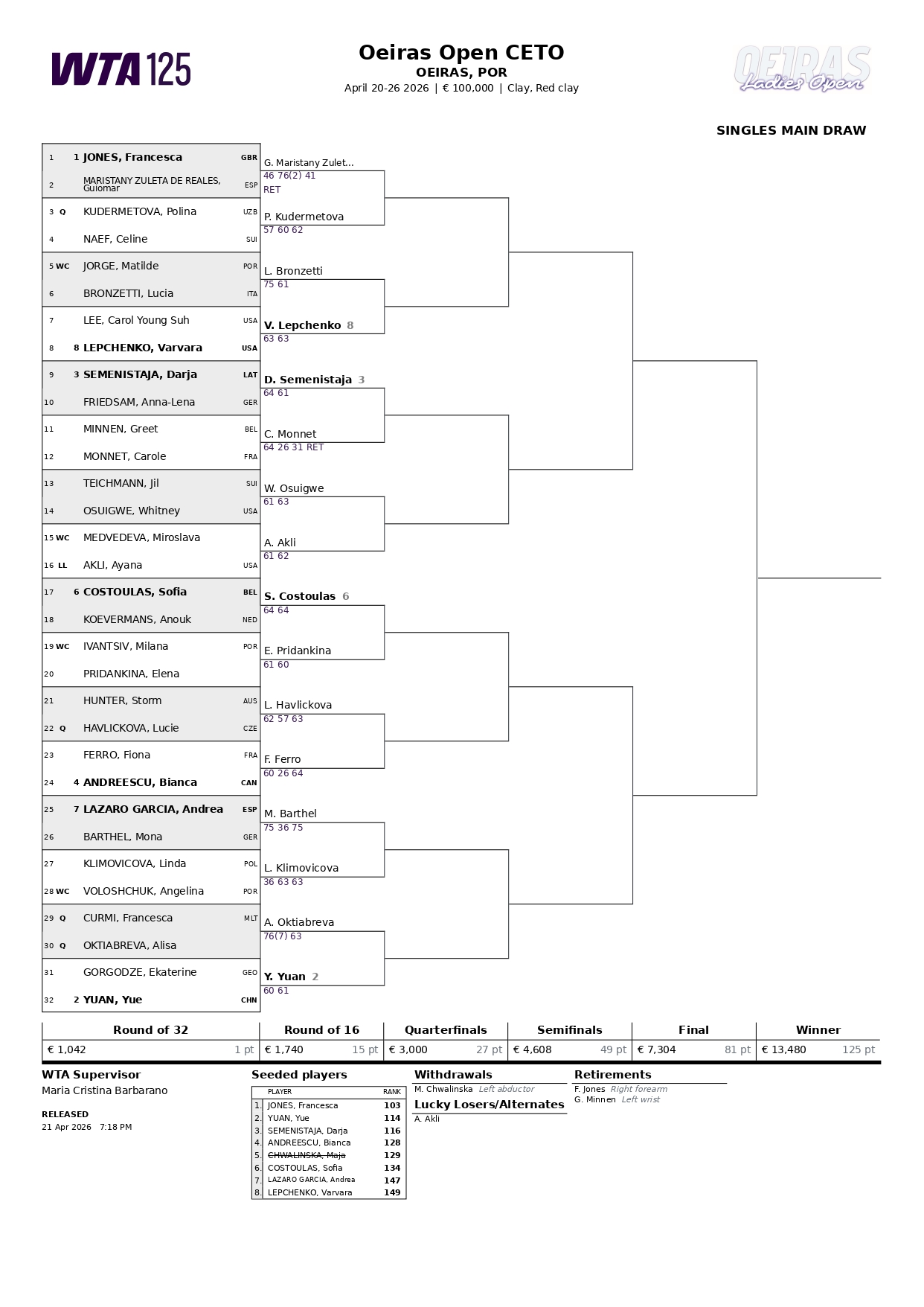 Esta quarta-feira vão disputar-se metade dos compromissos: Sofia Costoulas vs. Elena Prindakina, Alisa Oktiabreva vs. Yue Yuan, Lucia Bronzetti vs. Varvara Lepchenko e Guiomar Maristany vs. Polina Kudermetova. A jornada vai arrancar às 10h30 no Clube Escola de Ténis de Oeiras.