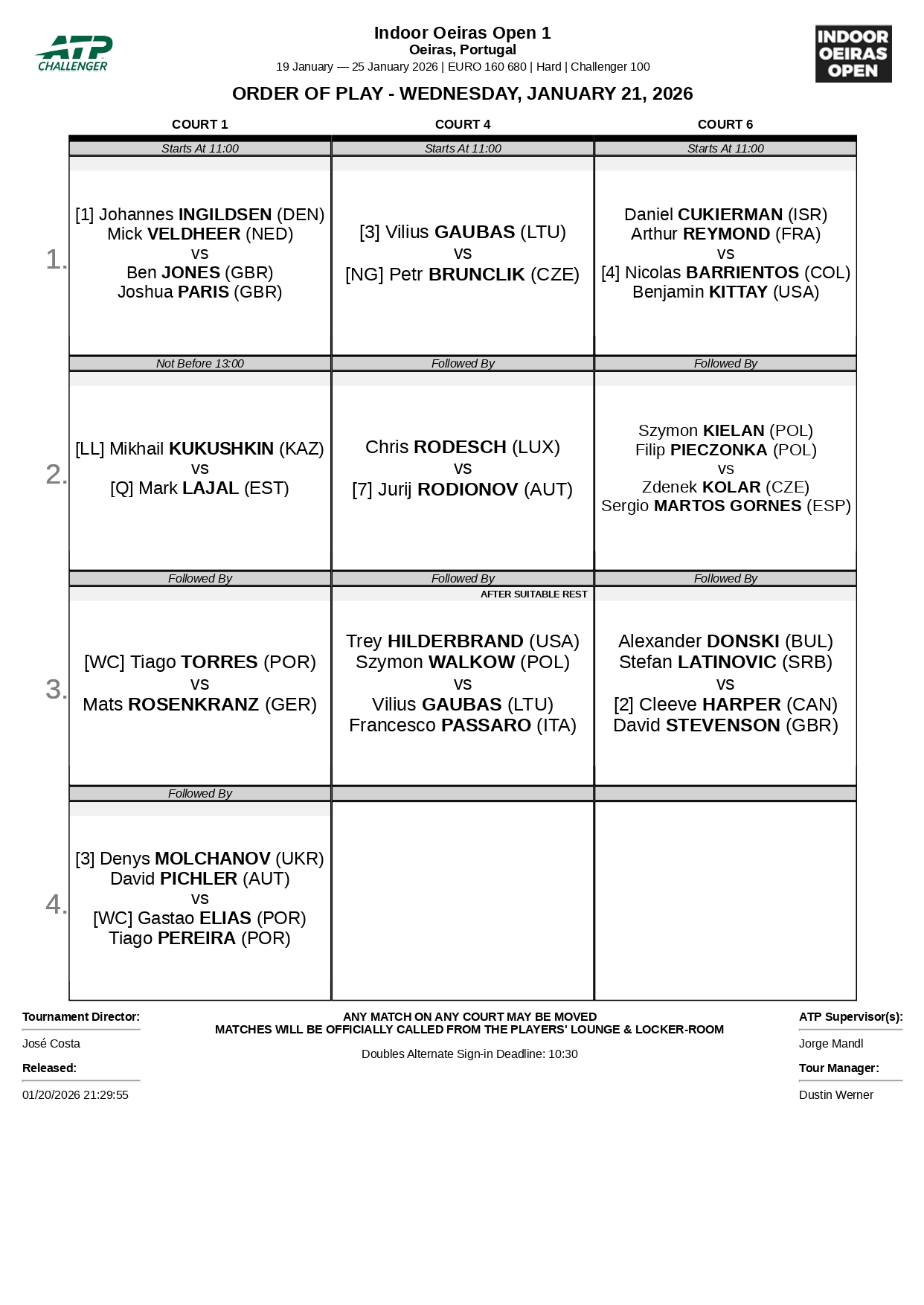 Rodionov vai agora medir forças com o luxemburguês Chris Rodesch (209.º), em recente boa forma, que tirou da prova o dinamarquês August Holmgren (193.º), campeão do Porto Open em 2024 e especialista de pisos rápidos, com os parciais esclarecedores de 6-3 e 6-2 sem sequer enfrentar um ponto de break.