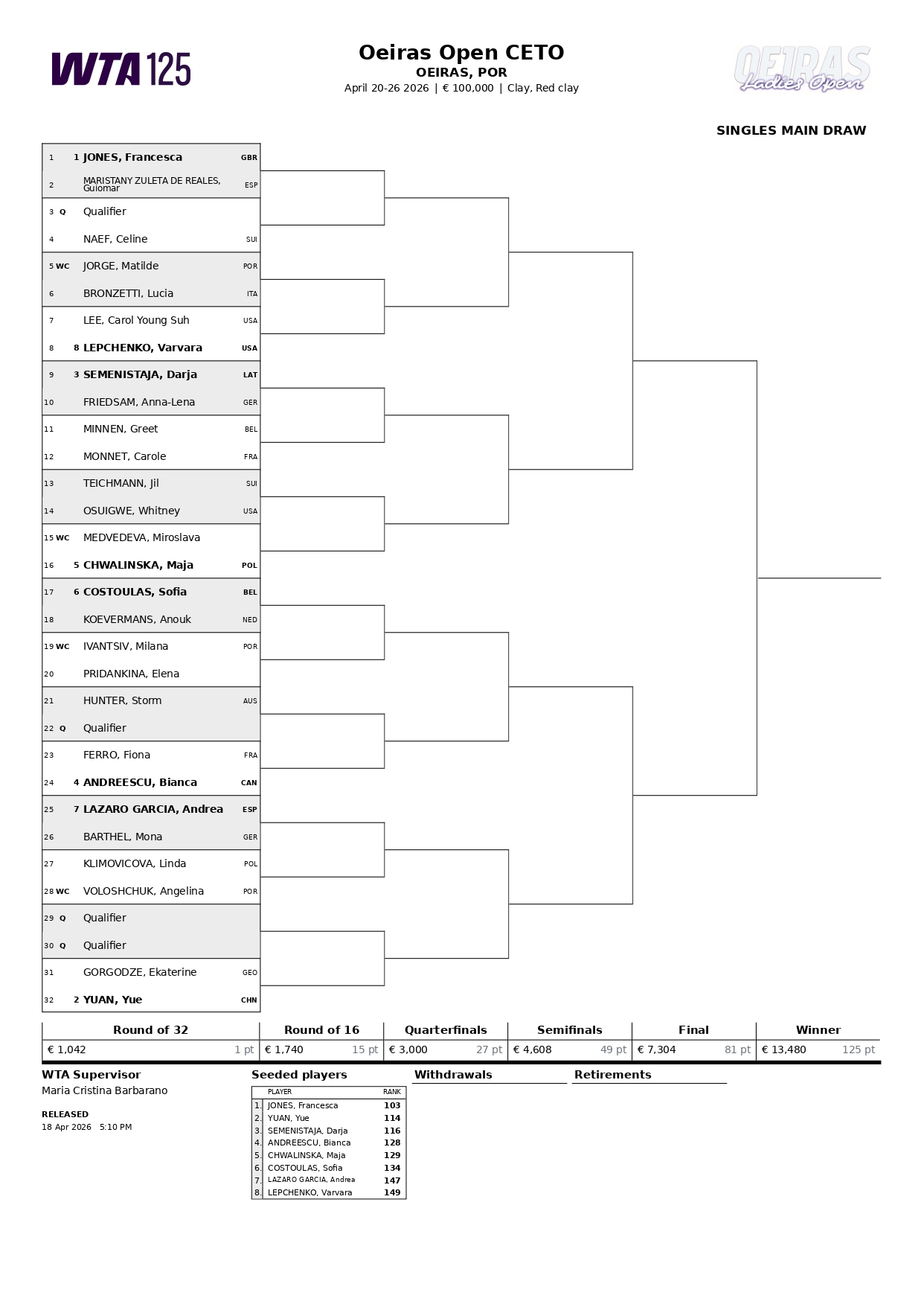 O torneio é encabeçado por Francesca Jones (103.ª) e tem Yue Yuan, campeã em título e ex-36 WTA (atual 114.ª e detentora de um título WTA em duas finais) como líder da metade inferior da grelha.